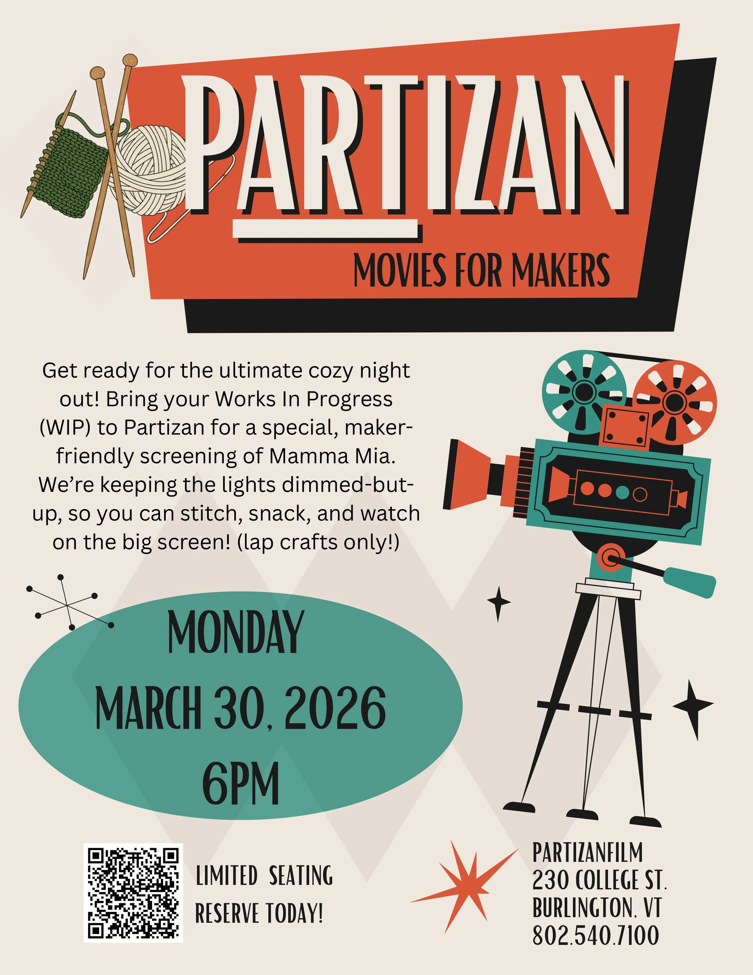 OPEN AT NOON ON FRI-SUN, 1:30 PM ON MON-THURS for coffee, beer, wine, and books (with occasional variations in accordance with our movie schedule). Holiday hours may differ. Partizanfilm is a member-run nonprofit — learn more or join now.
